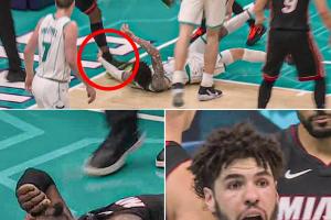 在第二节的一次进攻倒地后,黄蜂球星拉梅洛·鲍尔顺势抓到了热火内线阿德巴约的脚踝,致使后者失衡重摔在地,随后返回更衣室。