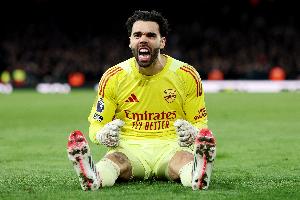 欧冠1/4决赛首回合,阿森纳1-0小胜葡体,拉亚表现出色贡献5次扑救,沃尔科特赛后称赞了拉亚开场的一次扑救,他用指尖将对方的射门扑到横梁上。