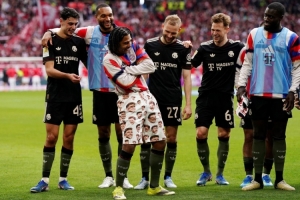体育资讯4月5日讯 拜仁在本轮德甲3-2逆转绝杀弗赖堡,拜仁球员在赛后照例进行了庆祝。
